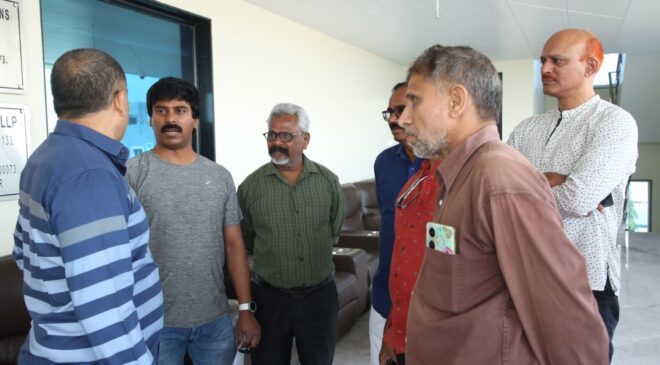 ఆరు దశాబ్దాల సుదీర్ఘ చరిత్ర కలిగిన ‘ఫిల్మ్ క్రిటిక్స్ అసోసియేషన్’ కొత్త కార్యవర్గంతో కొలువుదీరడం తెలిసిందే. అసోసియేషన్ ప్రతిష్టను మరింత పెంచేలా ద్విగుణీకృత ఉత్సాహంతో పని చేస్తూ… త్వరలో డైమండ్ జూబ్లీ సెలబ్రేషన్స్ (60 ఏళ్ల సంబరాలు) నిర్వహించేందుకు సన్నాహాలు చేస్తున్న ఫిల్మ్ క్రిటిక్స్ అసోసియేషన్ నూతన కార్యవర్గం… ప్రముఖ నిర్మాత, తెలంగాణ ఫిలిం డెవలప్మెంట్ కార్పొరేషన్ చైర్మన్ దిల్ రాజును ఆయన కార్యాలయంలో మర్యాదపూర్వకంగా కలిసింది!! తెలంగాణ ప్రభుత్వం తరఫున ఇస్తున్న ‘గద్దర్ అవార్డ్స్’ వేడుకను ఈ ఏడాది కూడా అద్భుతంగా నిర్వహించడంలో… టి.ఎఫ్.డి.సి. చైర్మన్ హోదాలో కీలక పాత్ర పోషించిన దిల్ రాజును ఈ సందర్భంగా అభినందించింది. సోలోగా హిందీలో సల్మాన్ ఖాన్, అక్షయ్ కుమార్ లతో తను నిర్మిస్తున్న సినిమాలకు సంబంధించిన విశేషాలను కార్యవర్గ సభ్యులతో ఆయన పంచుకున్నారు. దిల్ రాజును కలిసినవారిలో ఫిల్మ్ క్రిటిక్స్ అసోసియేషన్ గౌరవాధ్యక్షులు ప్రభు, అధ్యక్షులు బత్తుల ప్రసాద్, జనరల్ సెక్రటరీ సురేష్ కొండేటి, ట్రెజరర్ భరద్వాజ, వైస్ ప్రెసిడెంట్ జనార్దన్ లతోపాటు జాయింట్ సెక్రటరీలు పర్వీన్, శ్యామ్ రావుట్ల, కార్యవర్గ సభ్యులు, ధీరజ అప్పాజీ, కుమార్, సీనియర్ ఫోటో జర్నలిస్ట్ వాసు ఉన్నారు.